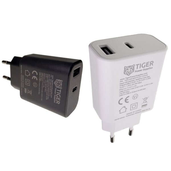 The Tiger Power range of USB chargers are safety approved and highly reliable, meeting latest level VI energy efficiency legislation. The TGR-USB-20W-PD-EU-1C1A series is designed to power a wide range of devices including those that support super fast charging such as smart watches and mobile phones. These units feature a USB C port and a USB A port for maximum device and cable compatibility. Available in White and Black cases. Custom branding is also available