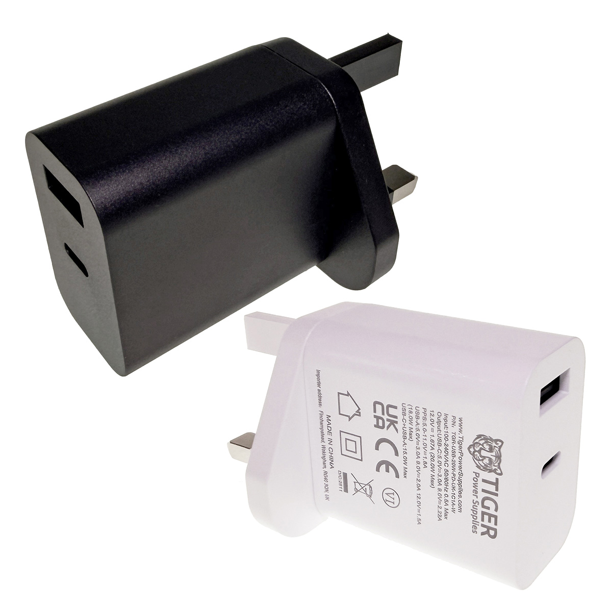 The Tiger Power range of USB chargers are safety approved and highly reliable, meeting latest level VI energy efficiency legislation. The TGR-USB-20W-PD-UK-1C1A series is designed to power a wide range of devices including those that support super fast charging such as smart watches and mobile phones. These units feature 2 ports. A single USB C port and also a USB A port providing maximum compatibility no matter what cable you have to hand